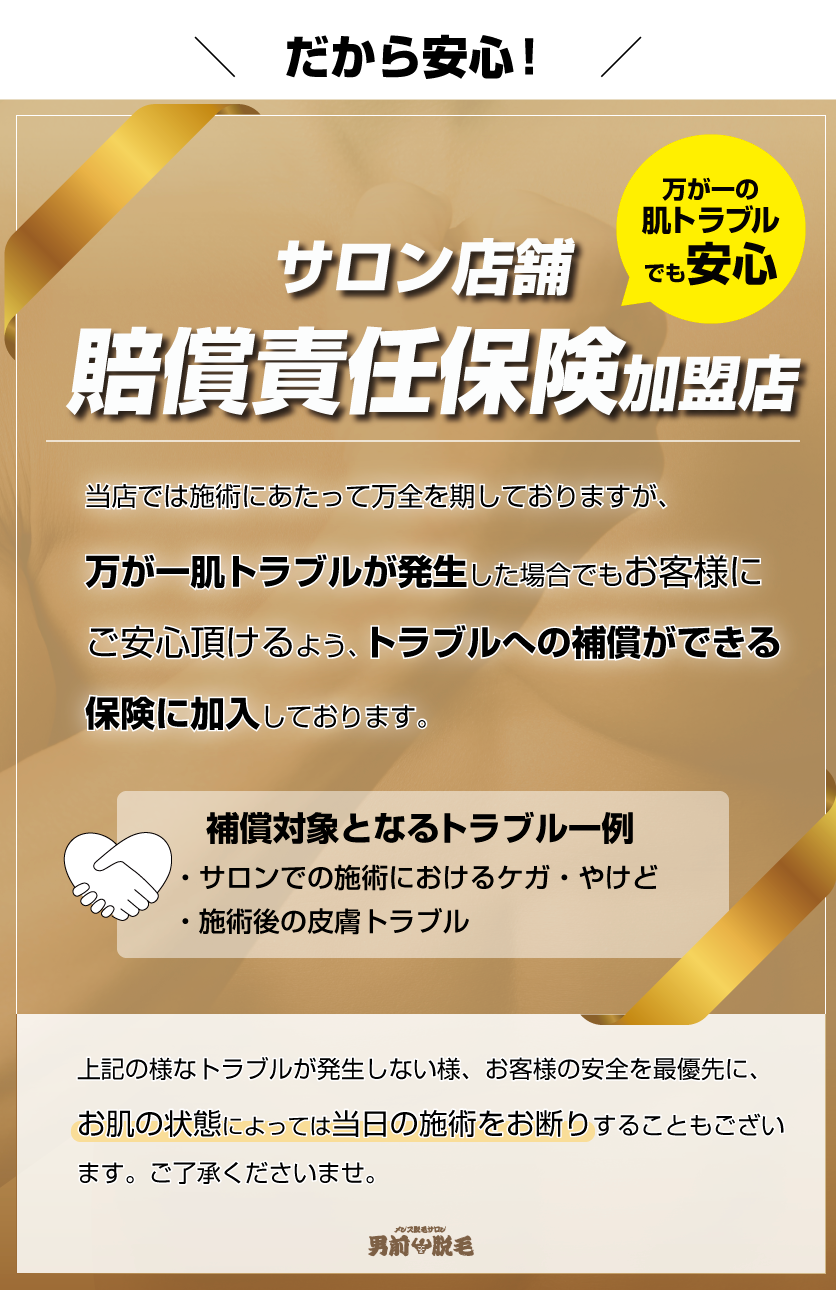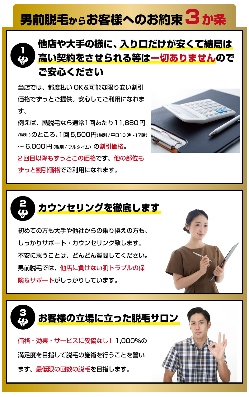 男前脱毛ではお客様との要望のギャップを限りなく埋めることに注力し 「親切」、「丁寧」、「細かな気配り」の3つをモットーにカウンセリングから施術まで自信を持って対応させて頂きます!!!